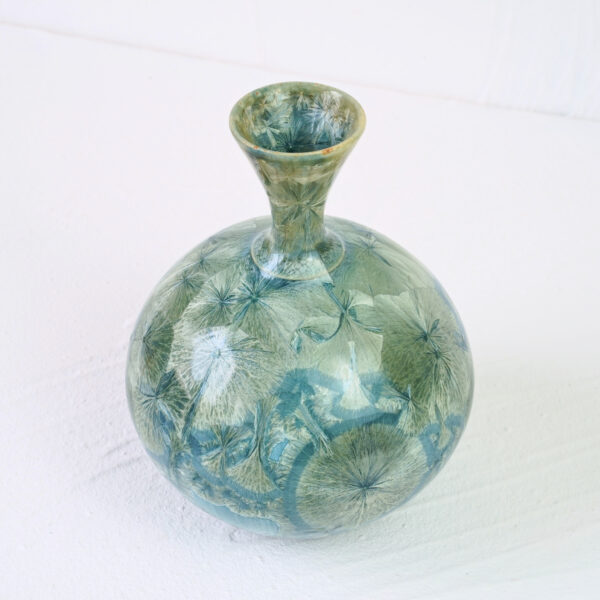 Crystalline is a specialist type of glaze where an interplay of heat, time and chemicals create distinct crystal growth formations on the surface during the firing process, resulting in unpredictable and stunning visual effects.